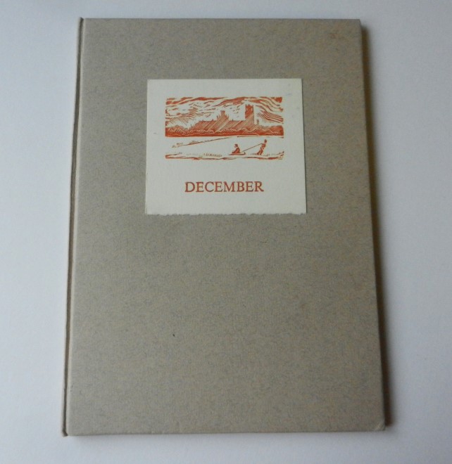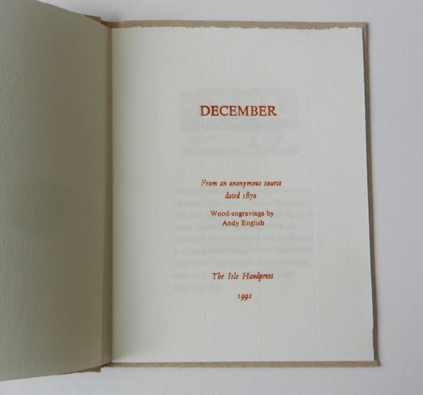 “December” contains three short extracts from an anonymous description of the month, dated 1870. Each text is accompanied by a small wood engraving; they are printed in burnt Sienna ink on white ingres paper and sewn into card covers., with a wrapper of brown ingres paper and a printed label. The regular edition measures 165 x 130mm.