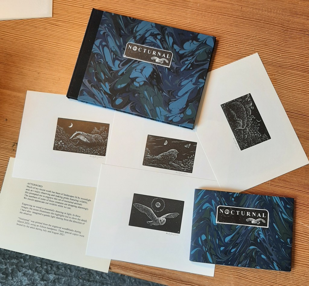 After a lengthy delay while I was working on commissions for other presses, the 26 specials of “Nocturnal” have finally been bound. These have been printed on larger paper (approximately 13 x 18cm) and casebound with a black cloth spine, a cover paper of marbled paper from Payhembury Papers, and a wood engraved label. Each book has a paper folder pasted onto the back endpaper with a sheet of text and four signed proofs of the following engravings from the book: Badger, Nightjar, Hedgehog and Barn Owl. The specials are lettered A – Z.