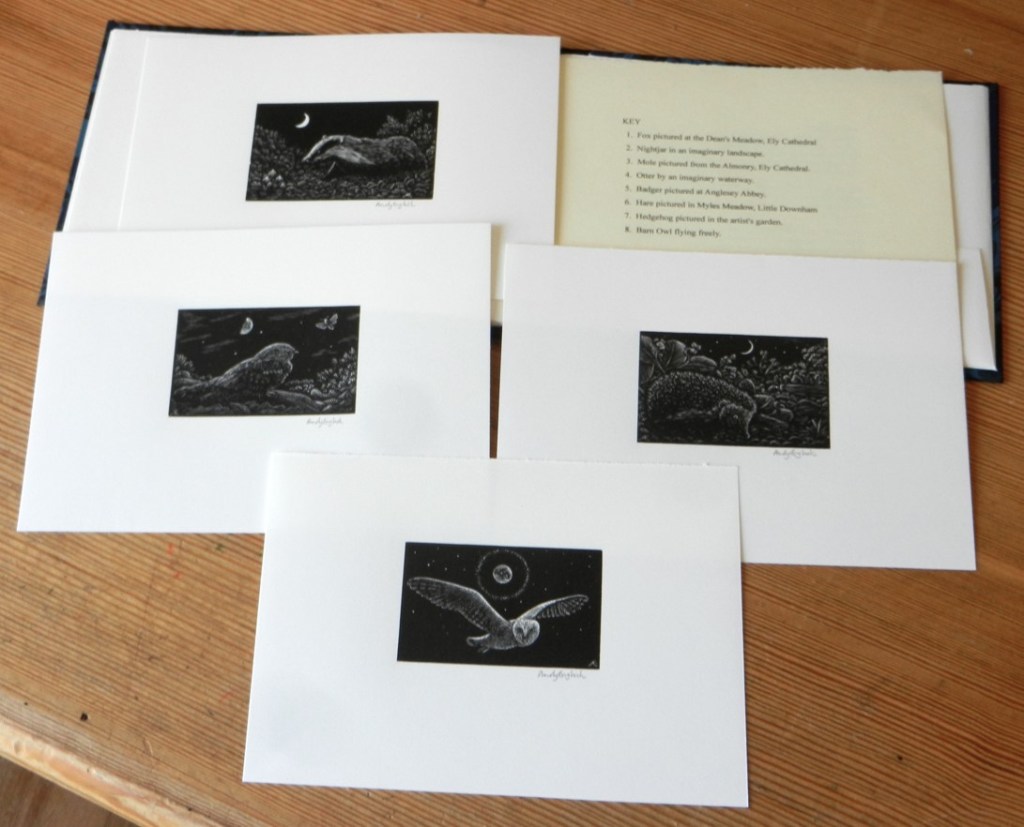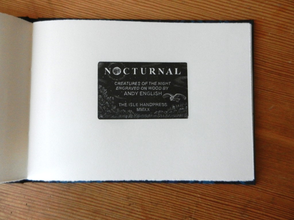 After a lengthy delay while I was working on commissions for other presses, the 26 specials of “Nocturnal” have finally been bound. These have been printed on larger paper (approximately 13 x 18cm) and casebound with a black cloth spine, a cover paper of marbled paper from Payhembury Papers, and a wood engraved label. Each book has a paper folder pasted onto the back endpaper with a sheet of text and four signed proofs of the following engravings from the book: Badger, Nightjar, Hedgehog and Barn Owl. The specials are lettered A – Z. These are now sold out.